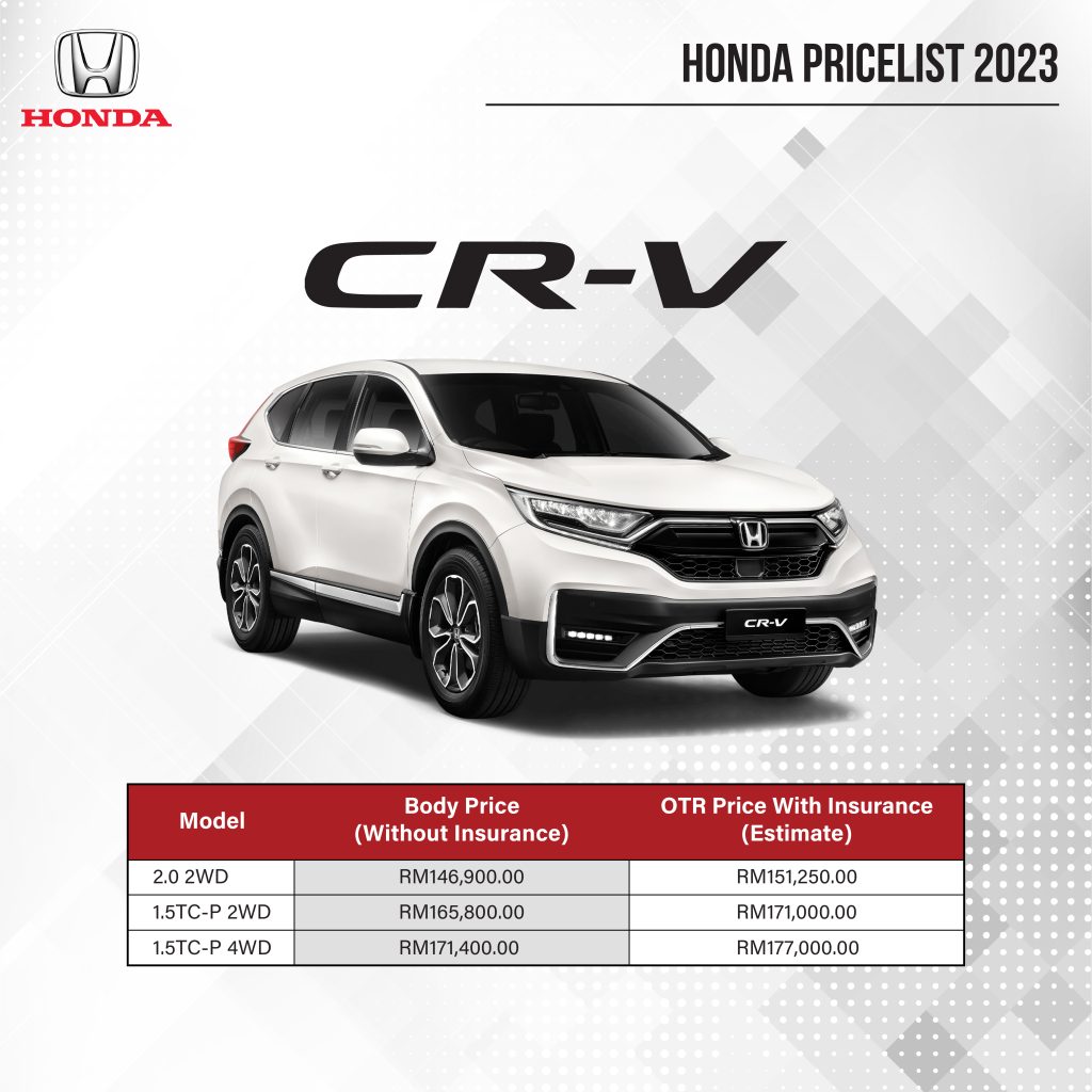 Berikut kami senaraikan harga CRV baru 2023 beserta spesifikasi penuh kereta ini. Sehingga kini, honda CRV merupakan antara model kereta paling laris di Malaysia untuk tahun ke-8 berturut-turut.